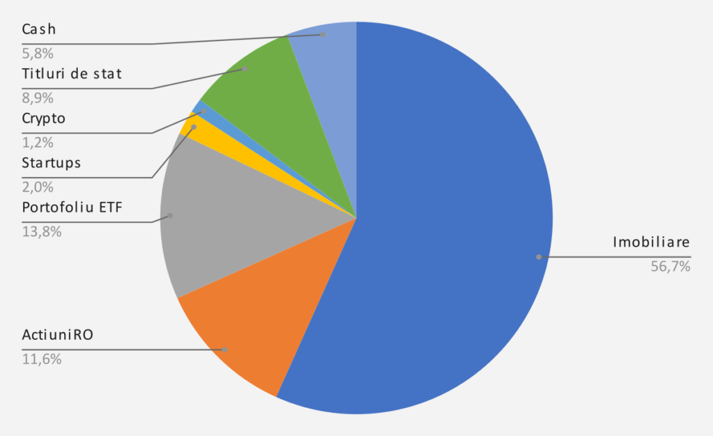 Cea mai mare componenta ramane partea de imobiliare, de 56.7%, iar cea mai mica ramane in continuare crypto, de doar 1.2%. Conform planului, partea de ETF-uri pe international a crescut usor in pondere, la 13.8%.